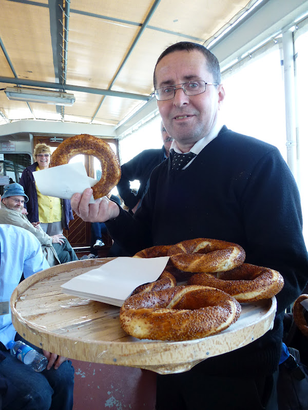 Aqui um dos vendedores ambulantes que circulavam pelo barco. Este vendia uma rosca tradicional que é coberta com gergelim. Havia uma velha senhora vendendo camisolas bem baratas. Vi também um vendedor-palhaço. Fazia rir todo mundo. Fazia mímicas, contorcionava-se, era brincalhão, pedia aplausos. Um verdadeiro show-man. Ele oferecia todo tipo de mercadoria: bengalas, guarda-chuvas e até um aparelhinho que tira suco das laranjas sem precisar descascá-las!